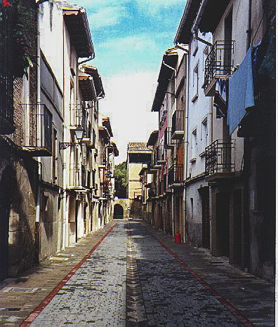 Saída de Sangüesa pela ponte sôbre o rio Aragón e continuando pelo acostamento da estrada N-240 que leva a Monreal.